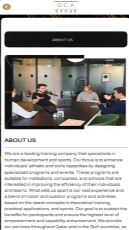 DCA GROUP company for human development and sports services provding athletic and skills capacities by designing specialized programs and eventsThat are suitable for institutions, companies, and schools Design and implement training programs in an interactive and modern manner Professionally manage and organize events and tournaments comprehensively Provide consultations for organizational development and individual performance analysis provide services throughout Qatar and in the Gulf countries, as well as in Jordan, Lebanon, Turkey, and Egypt.