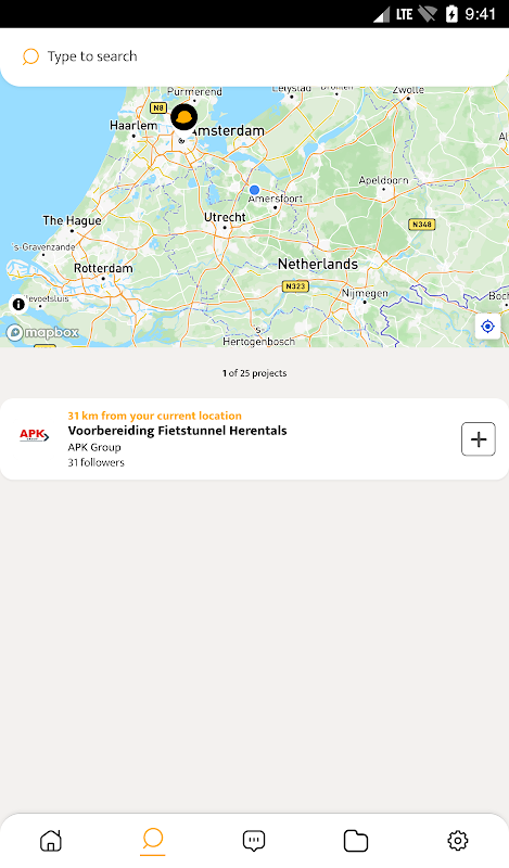 - Cari & ikuti: Cari projek atau syarikat pembinaan dan tambahkannya pada kegemaran anda.