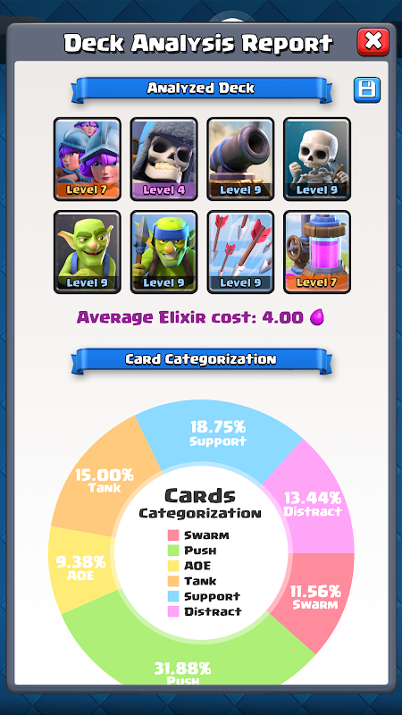Seperti yang kita tahu, membina yang seimbang Clash Royale pertempuran dek sentiasa utama untuk mencapai kejayaan dalam Clash Royale. Deck Analyzer menganalisis setiap dek pertempuran secara terperinci dan menyediakan anda dengan semua maklumat yang paling penting untuk mewujudkan satu pertempuran dek yang seimbang dan berkuasa. Deck Analyzer juga menjimatkan banyak masa dari percubaan dan kesilapan dan percubaan buta apabila membina dek pertempuran baru dalam Clash Royale.