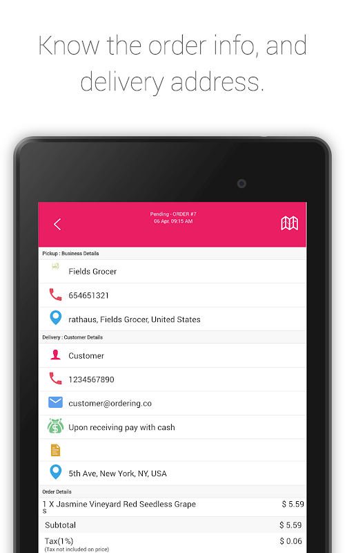 The order will show on the driver's app; here the driver will accept or reject the pick up of the order after this was accepted they would see as the information regarding of the customer's order (name, phone number, address) and delivery details (address, etc.).