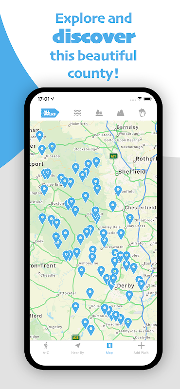 Aplikasi Derbyshire Walks merangkumi peta laluan berkemampuan GPS yang mudah digunakan yang meliputi 250 laluan pejalan kaki yang menakjubkan antara 1 dan 10 batu di seluruh Derbyshire dan kawasan sekitarnya.