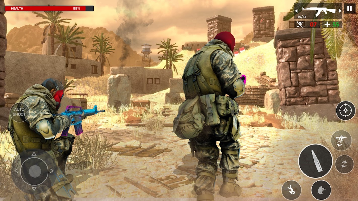 Ambil kedudukan anda di titik tinggi untuk membidik dan menyasarkan musuh. Gurun penuh dengan pengganas tersembunyi di bawah bukit pasir. Perhatikan dengan teliti untuk menumpaskan musuh dengan tembakan penembak tepat fps mahir anda.