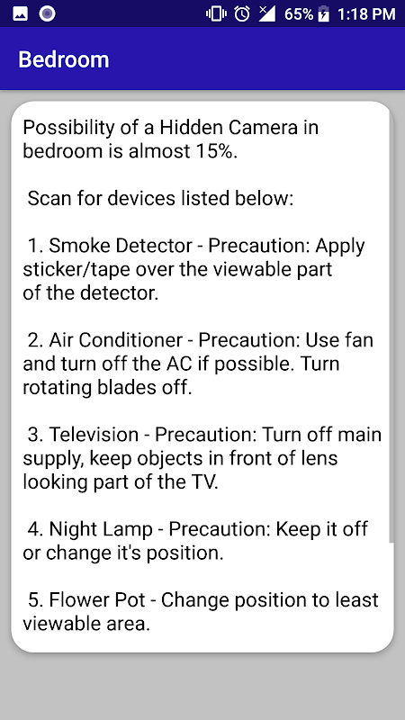 Now-a-days that technology is smaller and cheaper than ever, it's become easy to install cameras almost anywhere. In fact, once you start looking, you may realise that cameras are everywhere: on traffic signals, in parking lots and inside stores. If you're going to install this app on your phone while waiting for your morning coffee, there's probably a camera keeping an eye on you right now. You may even have seen some "hidden" cameras of your own, like for home security. These cameras have plenty of perfectly legitimate uses. They can provide security in public spaces and prevent theft in businesses. The problems arise when they're used for bad purposes. To avoid it, just install this Detect Hidden Camera app and protect yourself and your family.