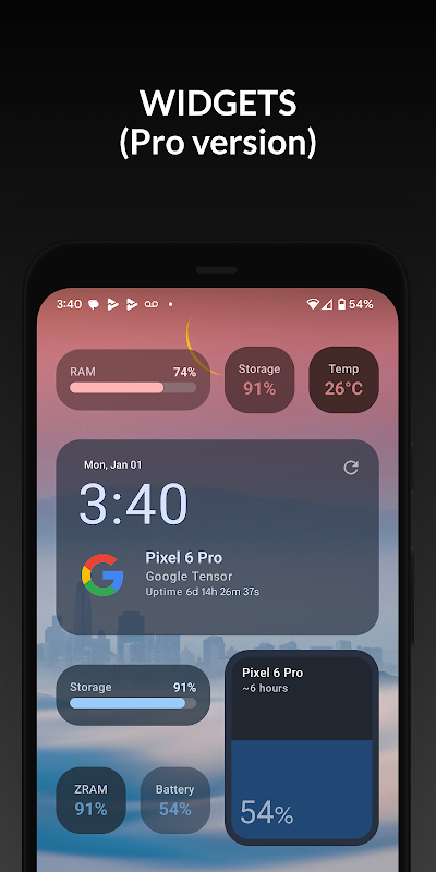 Widget moden yang boleh disesuaikan untuk skrin utama anda. Pantau bateri, RAM, storan dan statistik lain sepintas lalu.