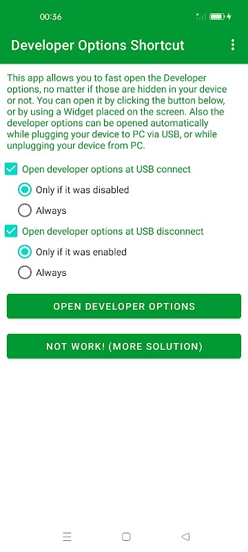 Apl ini membolehkan anda membuka pilihan Pembangun dengan pantas. Langkah standard untuk membuka pilihan Pembangun ialah Tetapan > Pilihan pembangun.