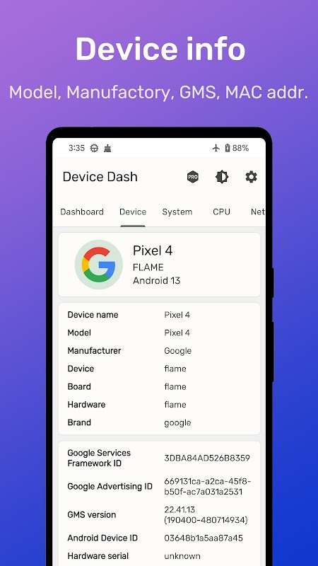 Device Dash adalah alat efisien yang menampilkan berbagai parameter dan informasi perangkat keras dan perangkat lunak untuk Anda. Tema ini menggunakan bahasa desain Material You, dan warna tema berubah seiring dengan wallpaper di Android 12 dan yang lebih baru.
