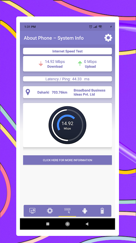 Selain memberi maklumat mengenai maklumat sistem telefon. Anda boleh menggunakan Aplikasi ini untuk ujian kelajuan wifi.