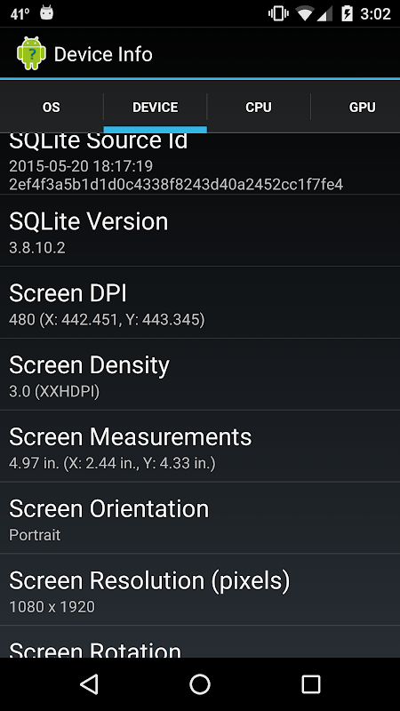 A very simple and small utility that displays various tidbits of information about the device WITHOUT needing any special permissions. Can be useful for developers to quickly determine device metrics or for people who are just curious about the type of device they have. Information displayed: