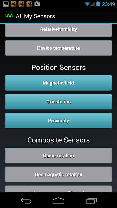 List all sensors available on the device along with their current values and provides (when available) a simple application for each sensor.