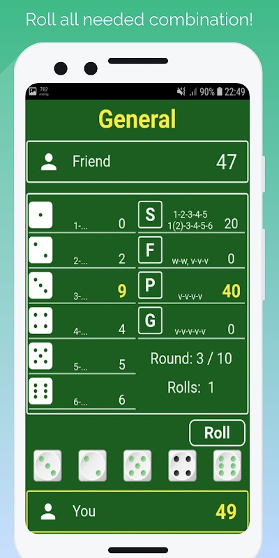 Apl ini mengandungi empat permainan dengan dadu: "Ribu", "Umum", "Dice Dodge" dan "Babi".