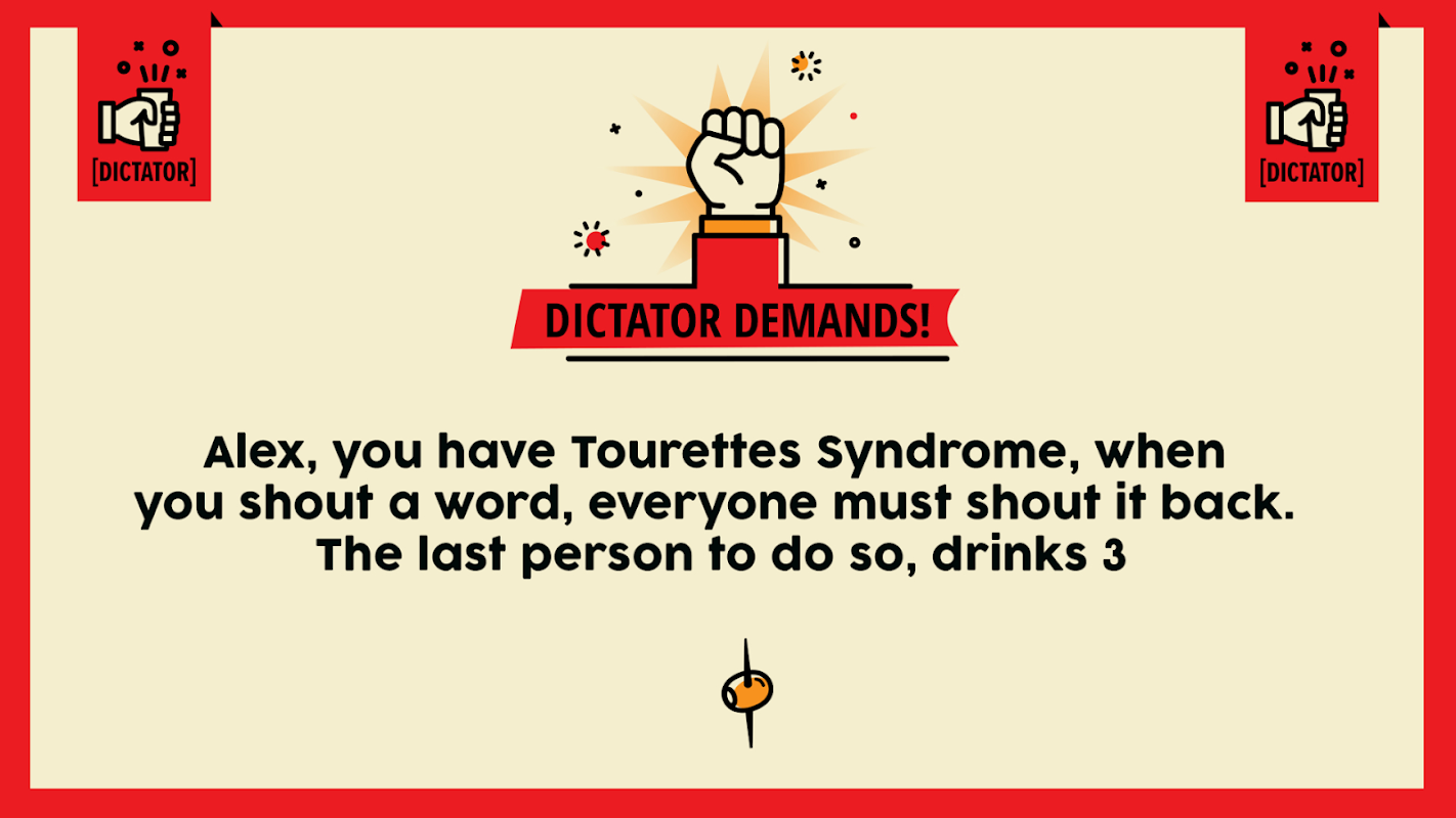 Dictator is a brand new drinking game & party game that you and your friends won’t be able to stop talking about!