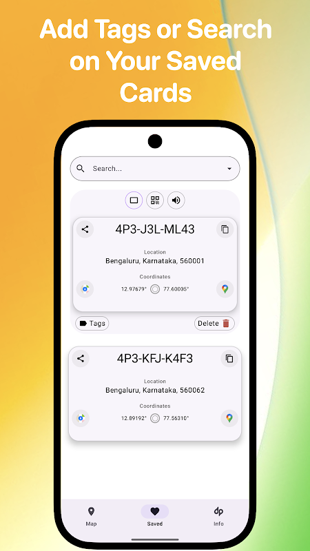 Simpan DigiPins kegemaran anda sebagai kad. Tambahkan teg seperti "rumah" atau "pejabat" dan cari kemudian menggunakan DigiPins separa atau istilah alamat.