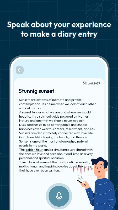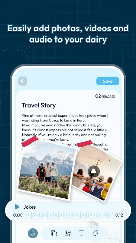 Buat diari anda dengan mudah dengan menambahkan tajuk, penerangan, tarikh dan masa. Tambahkan nota suara, nota teks dan imej daripada galeri anda untuk menjadikan diari anda lebih diperibadikan.