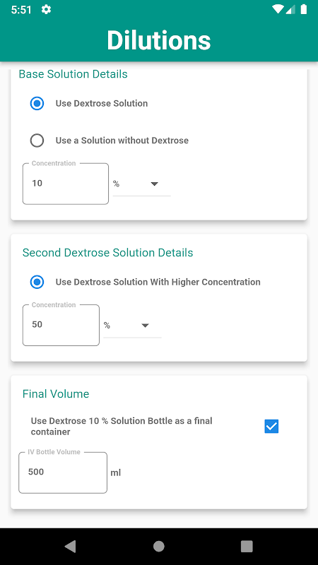 Aplikasi mudah ini akan membantu anda mengira jumlah yang diperlukan untuk menyediakan sebarang jumlah penyelesaian akhir dengan kepekatan yang diperlukan dengan mencampurkan 2 larutan. Contohnya cara menyediakan Dextrose 15% daripada: