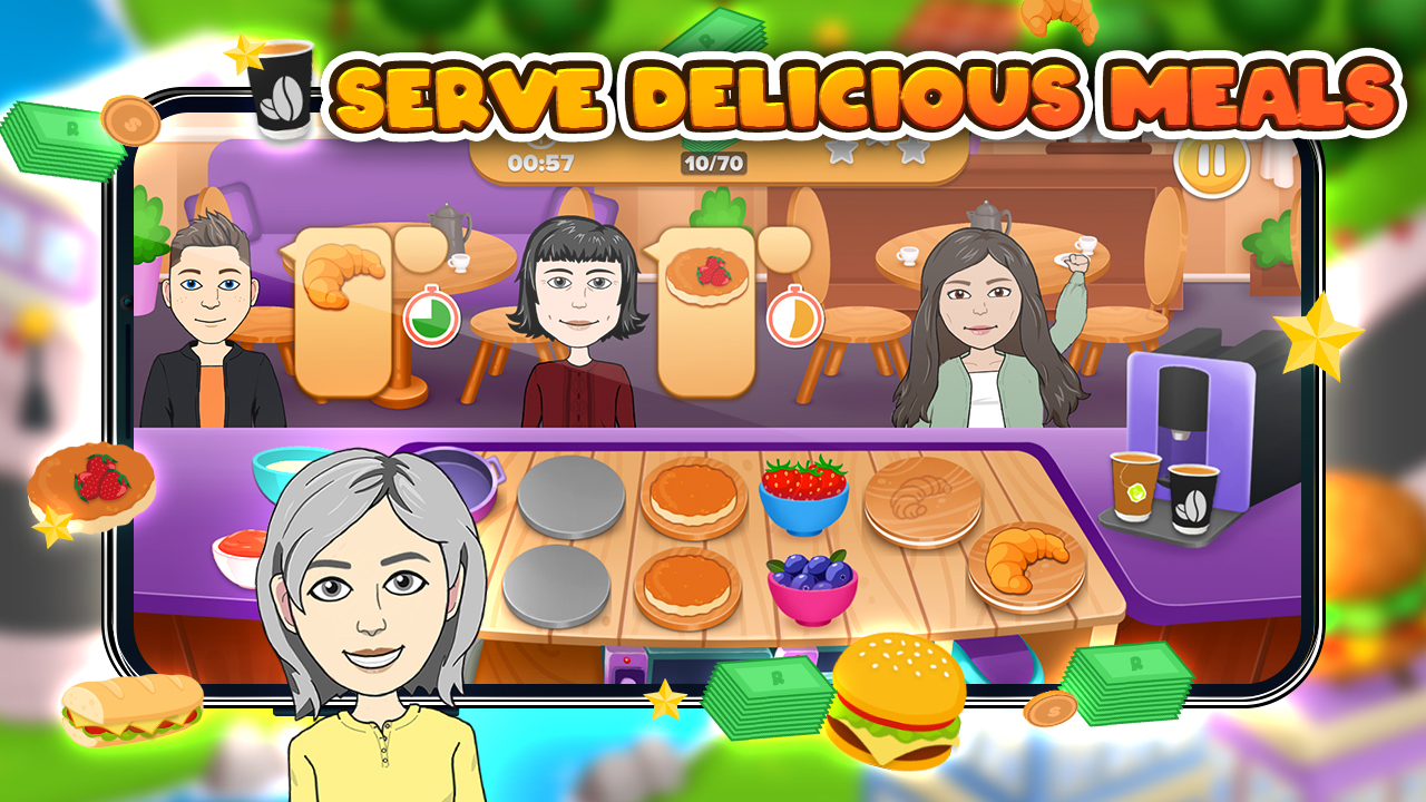 Buka kedai makan anda untuk memasak pelbagai jenis makanan di dapur anda termasuk Pancake, Pizza, Burgers dan banyak lagi. Kemajuan melalui bandar, menaik taraf restoran anda untuk meningkatkan kapasiti perkhidmatan anda.