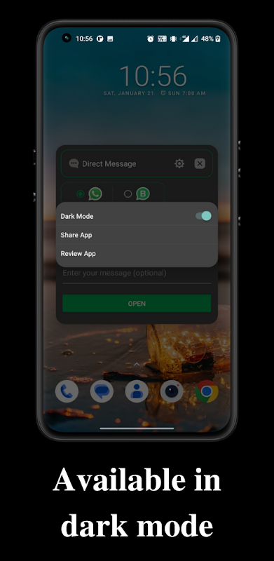 This helps everyone that requires frequent use of WhatsApp with unknown users and unsaved numbers. It will quickly open a WhatsApp or WhatsApp Business to send message without wasting time in saving unnecessary numbers.