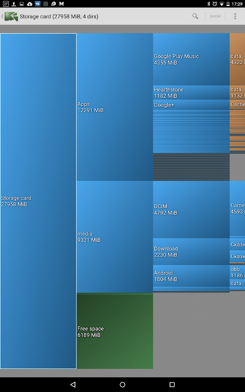 DiskUsage menyediakan cara untuk mencari fail dan direktori pada kad storan yang mengambil banyak ruang. Memaparkan gambar rajah dengan direktori / subdirektori berkadar dengan saiz mereka.