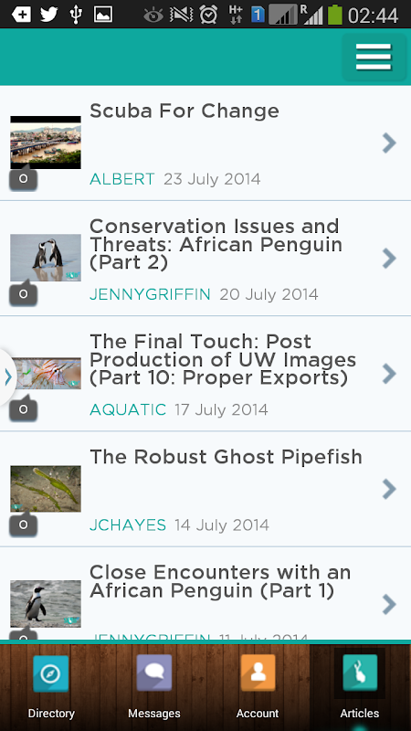 The articles tab displays a regularly updated feed of scuba diving related articles with a strong emphasis on underwater photography as well as marine life, scuba destinations and any anything else relevant to diving. Articles vary from tutorials on underwater photography to blog posts about a particular region.