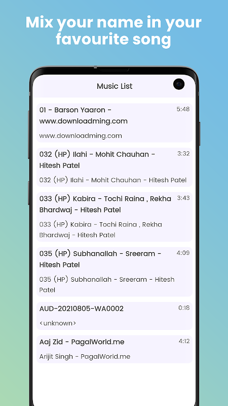 Pengadun dan Pembuat Nama DJ ialah Pengadun Nama DJ yang sangat mudah untuk Mencampur Nama DJ dalam Lagu. Terdapat suara dj berkualiti tinggi dalam Pengadun dan Pembuat Nama DJ ini. Aplikasi ini adalah pengadun satu langkah yang mudah. Pilih lagu masukkan nama anda dan campurkan. Apl sangat pantas dan statik. Anda boleh membuat nama dj tanpa had dan lagu nama dj.