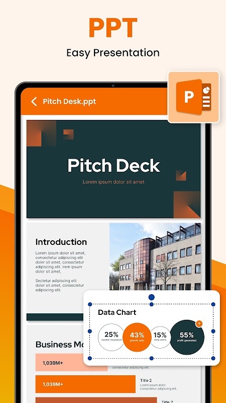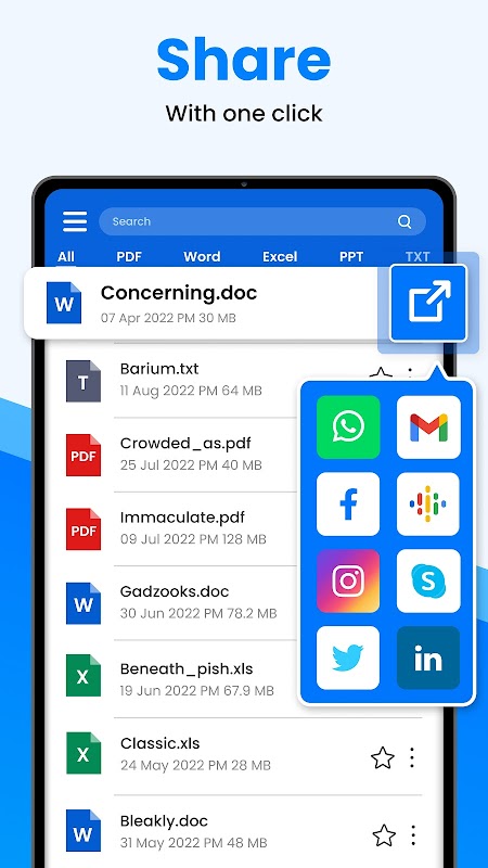 Pembaca Docx serasi sepenuhnya dengan mana-mana fail pejabat, termasuk fail doc, xls, docx, ppt, pdf dan teks. Ini ialah alat pintar dan membantu anda menjimatkan banyak masa kerana anda boleh melihat semua fail menggunakan pemapar Dokumen dari telefon anda dengan mengklik butang.