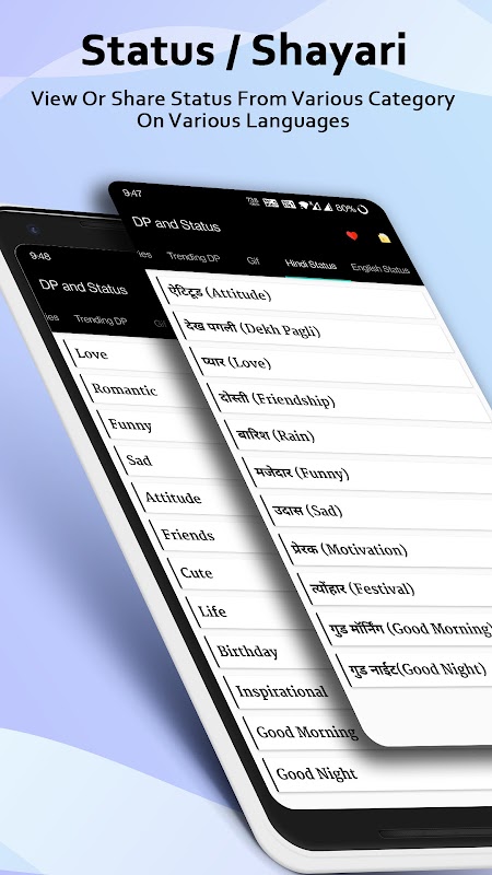 Kami memberikan DP dan Status yang paling popular untuk semua akaun rangkaian sosial anda. Terdapat trend baru untuk mengekalkan sebut harga terkenal sebagai status DP. Kami mempunyai gambar yang berbeza dalam kategori sehingga anda dapat mencari gambar dengan cepat. anda boleh berkongsi gambar dengan rakan anda dari aplikasi itu sendiri.