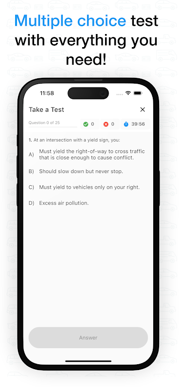 Kepakaran untuk Semua Jenis Pemandu: Sama ada anda memohon lesen memandu, permit pemandu atau memperbaharui lesen memandu anda, apl ini telah melindungi anda. Amalan yang disesuaikan untuk ujian lesen pemandu, ujian permit pemandu dan amalan ujian pemandu.