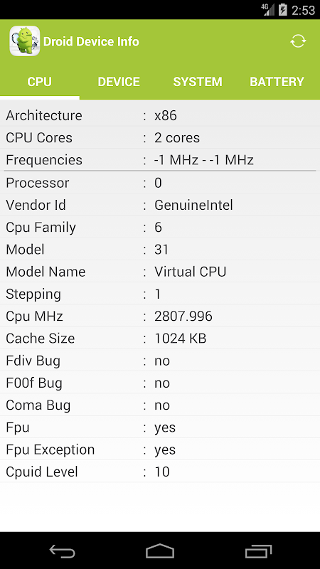 • Sistem: Android Version, Level API, Android ID, Kernel Architecture, Membina ID, Runtime Nilai, Root Access Kernel, dan Masa Sejak Reboot