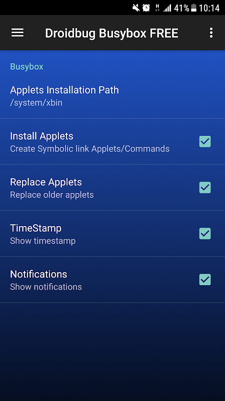 Droidbug BusyBox Advance combines tiny versions of ARM common UNIX utilities into a single small executable. It provides minimalist replacements for most of the utilities you usually find in GNU coreutils, util-linux, etc. The utilities in Droidbug BusyBox Advance generally have fewer options than their full-featured GNU cousins; however, the options that are included provide the expected functionality and behave very much like their GNU counterparts.