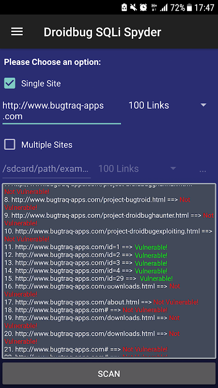 Droidbug SQLi Spyder is a powerful SQL scanner engine that can find :