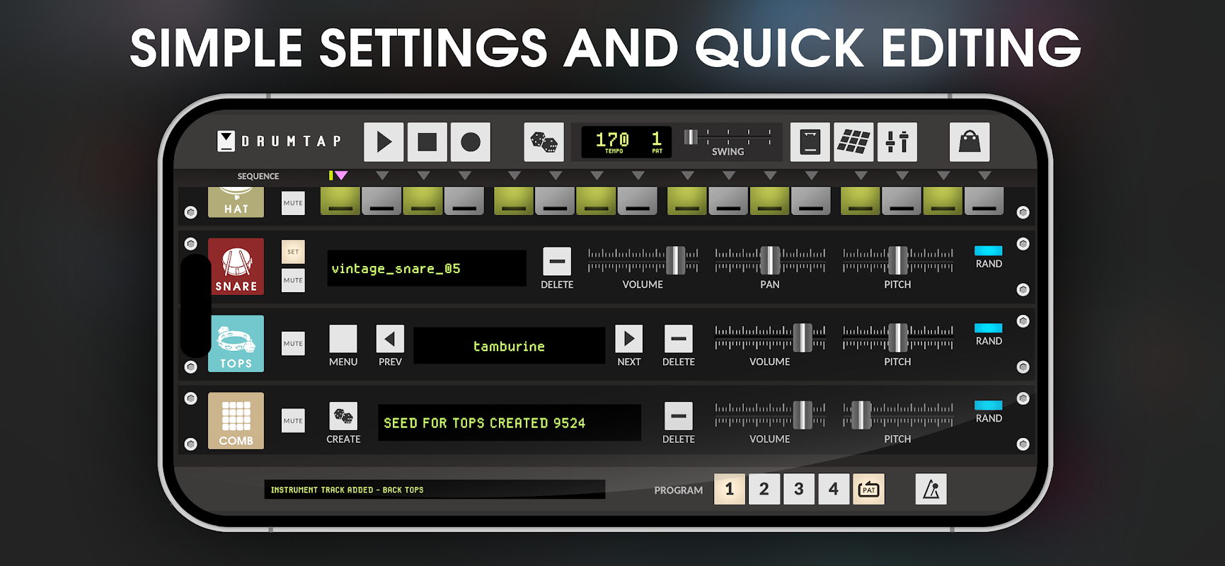 Mesin dram moden dengan antara muka mesra pengguna, direka oleh pengeluar bunyi profesional - AVMusic. Sequencer modular membawakan pelbagai ciptaan rentak pada peranti mudah alih. Mengandungi perpustakaan bunyi perkusi untuk hip-hop, perangkap, rumah, tekno, dram dan bes serta genre lain. Peluang menambah kiraan instrumen dram tanpa had dan rawak pintar pantas membolehkan anda membuat bunyi yang berbeza secara langsung dan membantu mencari bunyi baharu untuk trek anda. Pad dengan kependaman rendah untuk main secara langsung dan butang saluran untuk rakaman sesi langsung. Apl ini akan menjadi tambahan hebat kepada sesi langsung dan pengeluaran muzik anda.