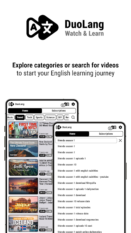 DuoLang: Tonton & Belajar ialah pemain sari kata pilihan anda, yang direka untuk menjadikan pembelajaran bahasa menyeronokkan dan berkesan. Tingkatkan kemahiran mendengar, bertutur dan perbendaharaan kata anda dengan video yang menarik dalam kategori kegemaran anda.