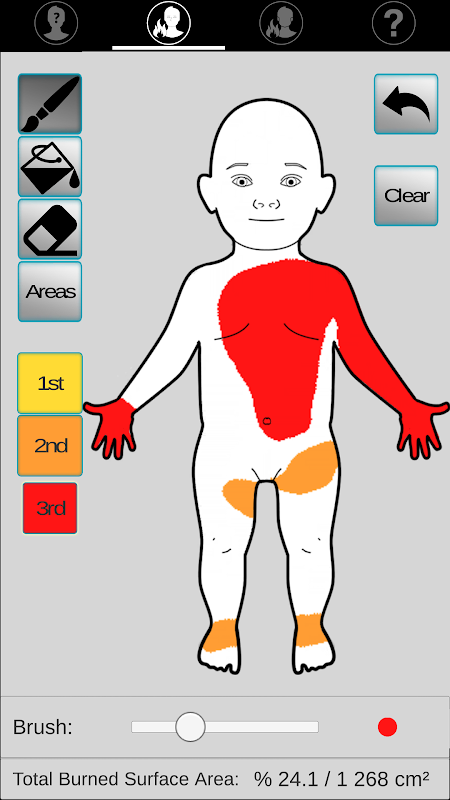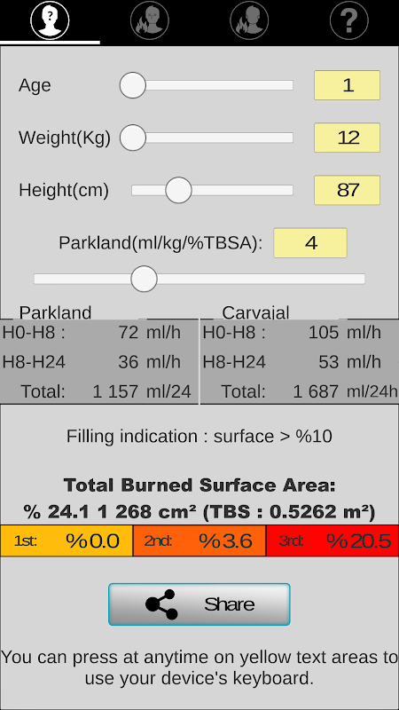 Permohonan bertujuan untuk membimbing pengisian awal orang terbakar yang besar (dewasa atau kanak-kanak) setelah dinilai secara tepat jumlah permukaan terbakar menggunakan lukisan (mengikut jadual Lund dan Browder).
