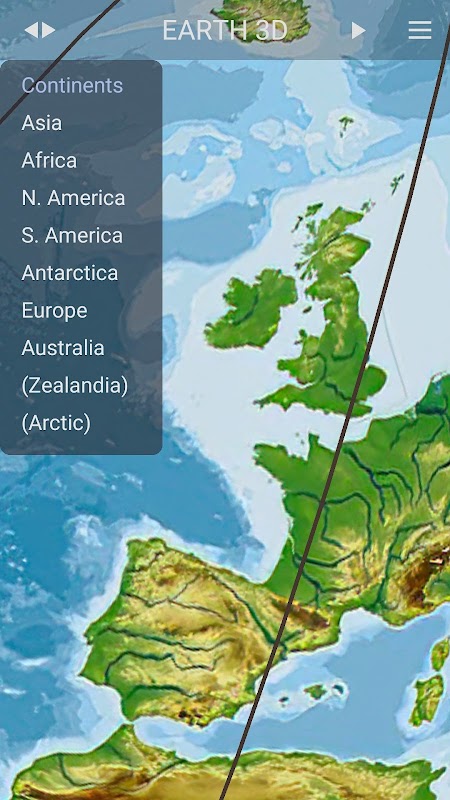Earth 3D membolehkan anda meneroka seluruh permukaan Bumi pada resolusi tinggi dengan mudah. Untuk melihat benua dan lautan, atau melihat dengan lebih dekat sungai utama dan rantaian gunung, hanya ketik pada menu sebelah kiri dan anda akan terus teleport ke koordinat masing-masing. Satu lagi ketik pada panel tengah, dan anda boleh melihat imej benua yang dipilih dan mengetahui lebih banyak butiran mengenainya. Galeri, Data Bumi dan Sumber hanyalah beberapa halaman aplikasi ini. Bayangkan anda mengembara dengan kapal angkasa yang boleh mengorbit planet kita, melihat terus ke permukaannya dan melihat beberapa formasinya yang terkenal, seperti muara Sungai Amazon atau Pergunungan Himalaya.