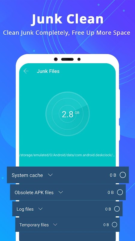 Junk file cleaner helps clear cache and junk files that take up memory and storage space, help improve and optimize the speed and performance of your phone.