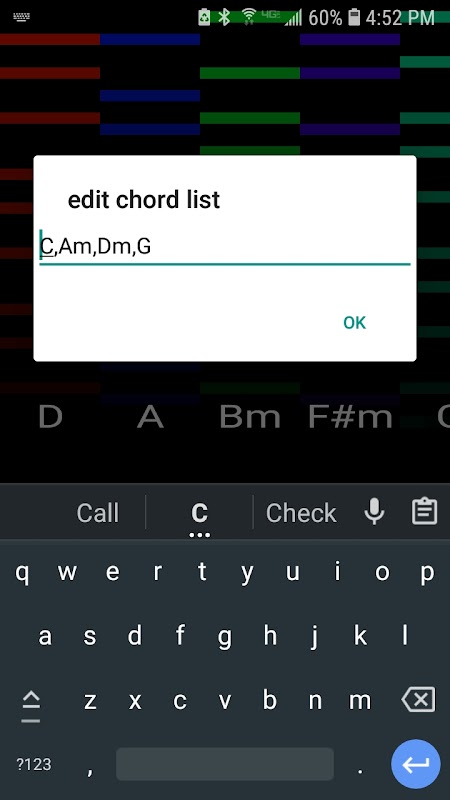 Jenis kord termasuk maj (lalai), min,malap,ogos,sus4,,maj7,7,6
