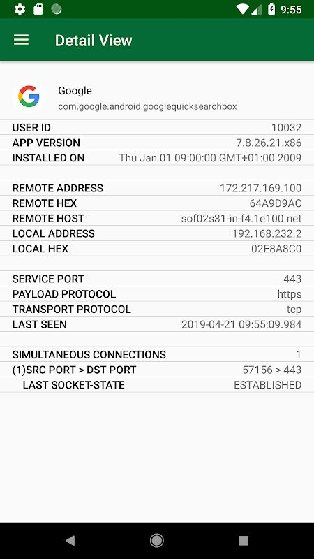- local and remote socket information along with hostnames and a protocol evaluation.