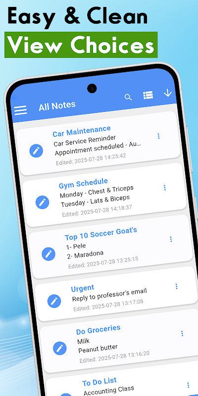Aplikasi ini membolehkan anda memaparkan nota melekit dan Memo dalam senarai atau grid dengan paparan terperinci serta pilihan paparan padat. Penulis Nota Percuma ini menawarkan pilihan untuk menyesuaikan antara muka buku nota dengan tema yang berbeza.