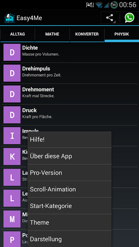 80+ menu points / functions: every class with some variables that can be calculated