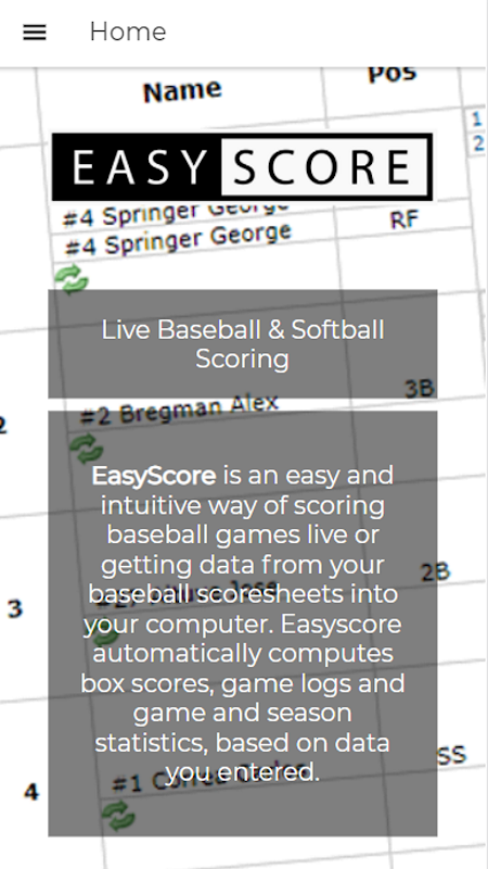 EasyScore memudahkan anda memasukkan lembaran skor besbol dan bola lisut. EasyScore secara automatik mencipta skor kotak, permainan demi permainan dan statistik untuk permainan dan sepanjang musim.