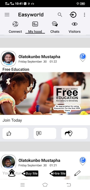 Easyworld mempunyai antara muka media sosial sendiri, yang mendorong perpaduan dan cinta antara jiran dalam sebuah komuniti. Ia membantu orang untuk mudah dijumpai dengan peluang yang lebih baik.