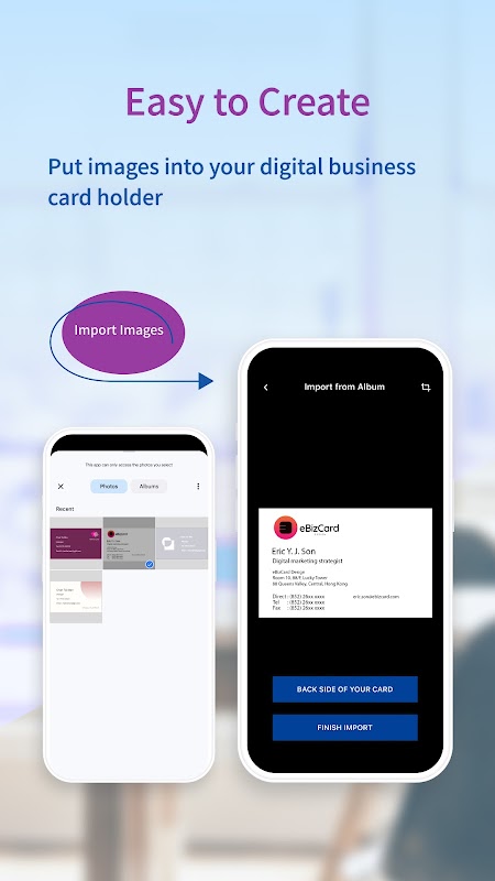 Sama ada anda berada di persidangan atau pertemuan kasual, berkongsi kad digital anda hanya dengan satu ketikan. Dengan eBizCard, anda boleh menyimpan atau mengedarkan kad anda dengan mudah.