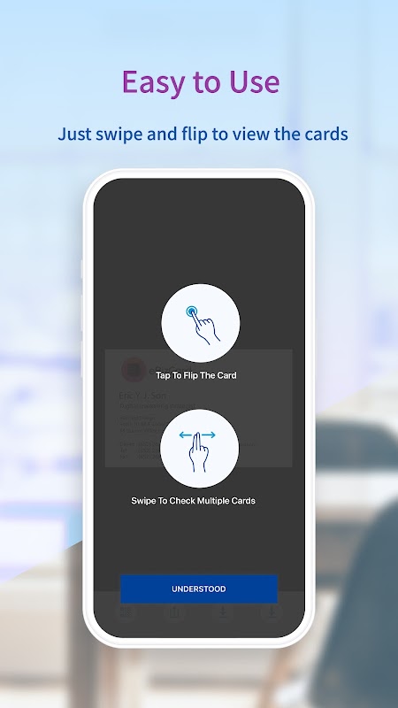 Dengan tumpuan pada kesederhanaan dan kemudahan penggunaan, eBizCard membolehkan anda melihat kad perniagaan digital anda dengan gerak isyarat leret dan flip yang intuitif. Anda juga boleh membuat kad baharu dengan mudah. Akses kad anda tanpa sebarang kerumitan - rangkaian dibuat mudah.