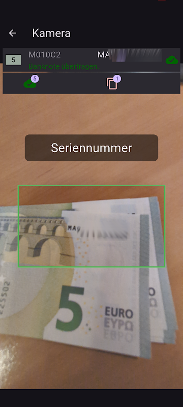 Untuk nota bank bernombor berturut-turut, anda mengimbas kod cetakan sekali dan kemudian berbilang nombor siri. Untuk nota bank terpakai, anda mesti mengimbas secara bergantian antara kod cetakan dan nombor siri.