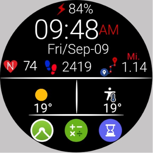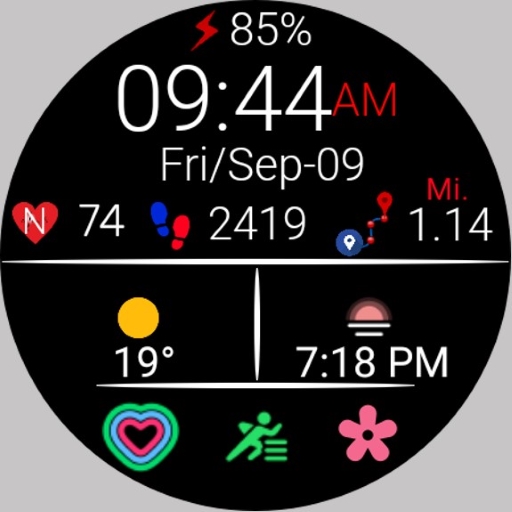 1) Menyediakan masa, maklumat kalendar, penggunaan % bateri, kadar denyutan jantung, kiraan langkah harian dan jarak yang dikira dalam batu atau Km berdasarkan kiraan langkah. Jarak akan berada dalam KM jika format jam telefon yang disambungkan ialah 24 jam. Jika tidak, ia akan berada dalam batu.