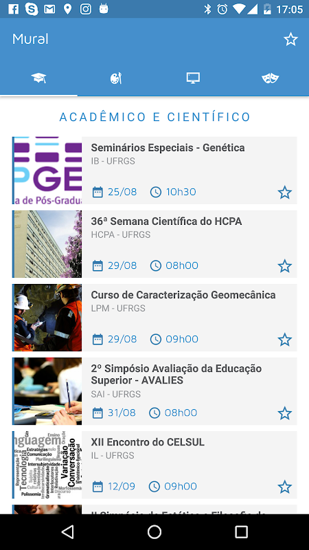 • Favoritar os eventos que você deseja participar, criando um mural personalizado. Qualquer alteração que for feita nos seus eventos favoritos será notificada para que você não perca nada!