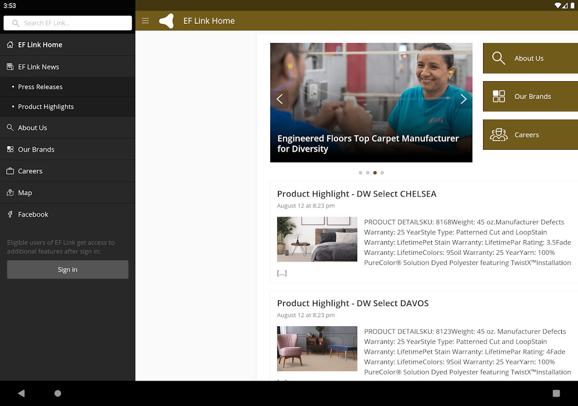 EF Link menyediakan akses mudah dan mudah alih kepada pelanggan, pekerja (semasa dan akan datang), vendor dan rakan kongsi perniagaan kami serta kepada rakan dan keluarga kami yang berminat dengan semua yang berlaku di pengeluar permaidani yang paling pesat berkembang di A.S.