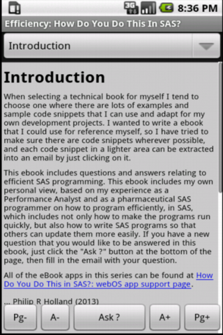 Aplikasi ini, "Kecekapan: Bagaimana Anda Adakah ini Dalam SAS", adalah salah satu daripada siri eBook tentang SAS pengaturcaraan perisian memberi tumpuan kepada soalan yang sering dan jawapan mengenai pengaturcaraan SAS berkesan bertanya, kedua-dua dalam kelajuan program dan penyelenggaraan, yang ditunjukkan oleh sampel kod yang boleh dihantar melalui e-mel terus dari app. Ia direka untuk menggalakkan pengguna untuk menyumbang soalan ada yang akan dimasukkan ke dalam versi masa depan app. Terdapat kawalan untuk memilih soalan-soalan khusus, beralih ke soalan sebelumnya atau seterusnya, mengurangkan atau meningkatkan font yang sesuai dengan keutamaan pengguna, dan menghantar e-mel yang meminta jawapan kepada soalan yang belum dimasukkan ke dalam versi yang daripada eBook.