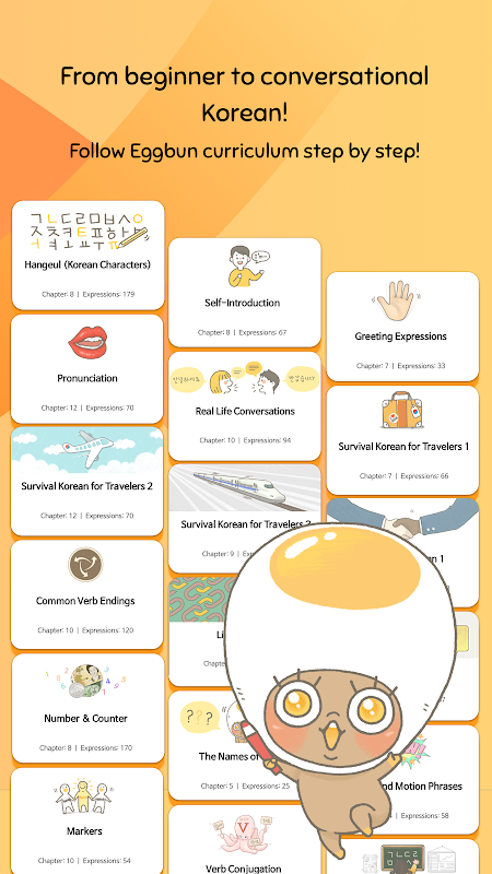 Berlatihlah Bahasa Korea secara menyenangkan dengan Eggbun sekarang juga, dan mari belajar Bahasa Korea bersama kami.