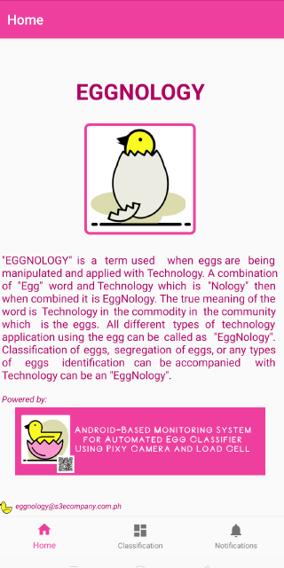 "EGGNOLOGY" is a term used when eggs are being manipulated and applied with Technology. A combination of "Egg" word and Technology which is "Nology" then when combined it is EggNology. The true meaning of the word is Technology in the commodity in the community which is the eggs. All different types of technology application using the egg can be called as "EggNology". Classification of eggs, segregation of eggs, or any types of eggs identification can be accompanied with Technology can be an "EggNology".