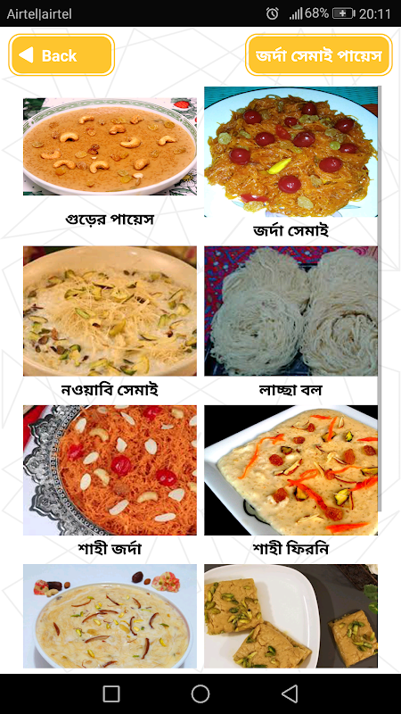 আমাদের এপসে রয়েছে - আমের শরবত, কমলার জুস, ক্রিম কাস্টার্ড, মিল্কশেইক, বোরহানী রেসিপি। মিষ্টি আইটেমের মধ্যে ফিরনি, শাহী খুরমা, নওয়াবী সেমাই, স্পেশাল পায়েস তৈরির রেসিপি। ঝাল আইটেমের মধ্যে ইটালিয়ান স্প্যাগেটি, ভেজিটিবল চাউমিন, চিংড়ি নুডুলস সহ কিছু মজাদার খিচুড়ি আইটেম যেমন আচারি খিচুড়ি, ভুনা খিচুড়ি, স্বাস্থ্যকর ওটস খিচুড়ি রান্নার সহজ রেসিপি।